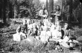 En familj på svampplockning i blåbärsskogen: föräldrarna Karl och Britta med döttrarna Lotta, som bär hinken och håller upp en kantarell, och lillasyster Mari-Ann.