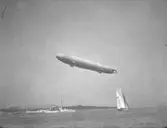 Frimärke ur Gösta Bodmans filatelistiska motivsamling, påbörjad 1950. Frimärke från Monaco, 1953. Motiv av Styrbar luftballong Zeppelin- typ
