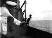 Fotografens notering: "Bli inte rädd för mig, jag var ej hälften så arg som jag syns vara, längst till höger står en Dansk. och det är Tredje styrman i midten".