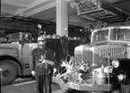 Brandmän i sin brandbil.Stegbil. 75 hkr "Castor" brandkårsautomobil, kardandriven, försedd med elektrisk belysning.1900 liter /minut Ludvigsbergs revolverpump samt 25 meter lång mekanisk utdragsstege. Leverad till Uppsala brandkår.