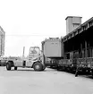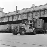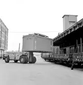 Lastning med containertruck, Svetruck 45120. Containervagn, Statens Järnvägar, SJ Lgjs.