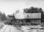 Vy vid Dannemora.Verkstaden med personal Tåg med DHJ lok 2 "Gimo"