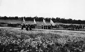 Officerare och manskap under stridsövning med gasmask. Andra bilder i Bergers samling tyder på att detta fotografi tagits vid landstigningsövningen på Stabbo i Stockholms södra skärgård 1929.