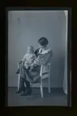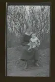 "Fru Pettersson, Lerbäcken" Porträtt av en kvinna sittandes ett litet barn i knät.