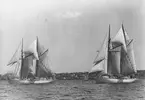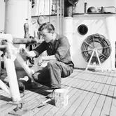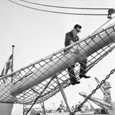 Utsikt från Skeppsholmen med skeppsgossebriggen Falken och logementsfartyget Vanadis. I bakgrunden Galärvarvet och Nordiska museet. I förgrunden flodsprutan S:t Erik.