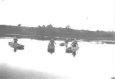 Fyra män står under bommen på en utombordare. En man sitter på fören med en filmkamera vänd mot de övriga männen och fotografen.