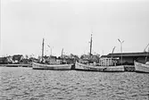 Fiskehamnen i Varberg. Fiskebåtar vid kajen, där ett par godsvagnar står på rälsen. I bakgrunden ses Kallbadhuset.