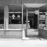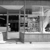 "Ingång till Edwin Andreassons och skyltfönster med diverse artiklar typ flaggstångskulor, rengöringsmedel, kaffekittel (Antonssons blandning)"