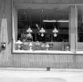 "Skyltfönster längst mot norr vid St. Hellevigsgatan, i skylten visas lampartiklar"