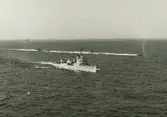 DJURGÅRDEN 5 och DJURGÅRDEN 6 på Stockholms ström. I bakgrunden: hangarfartyget HMS BULWARK (R08), fregatten HMS ANDROMEDA (F57).