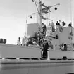 Vid husknuten står tre äldre damer. Till vänster om den välansade trädgårdsgången syns två stycken bikupor. Taket på stugan är av tjärpapp och ribbat.