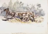 "Partie champêtre et halte dans un champ de de blé. 4 août 1857". Ett hölass som välter. Akvarell av Fritz von Dardel.
