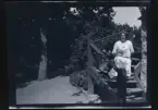 Bröderna Birger och Gunnar busar med sina systrar Elsa och Gudrun som sitter och handarbetar på en bänk utanför familjen Morthensens villa Solveden, Djursholm.