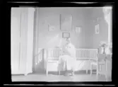 Ateljéporträtt av kvinna som sitter med stickning i knät. På det lilla bordet prytt med tofsar ligger nystanet.