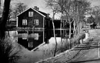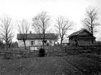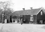 EXTERIÖR AV BÖCKERSBODA HANDEL I FÖRGRUNDEN ETT MINDRE FYRKANTIG KUR SOM SANNOLIKT INNEHÅLLER EN FOTOGEN- ELLER BENSINPUMP.