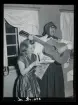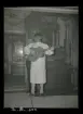En kvinna i folkdräkt står på trappsteget in till ett hus och sjunger. Intill och ett piano. Skansen, Stockholm.