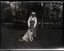 "Husmodersskolan". Kvinna i hembygdsdräkt, med hund.
