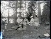 "Husmodersskolan". Kvinnor i skogsbacke, man med klarinett.