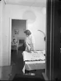 "Husmor med barn i hemmiljö" En kvinna står och stryker och i bakgrunden sitter ett barn i sin säng och skriker Interiör