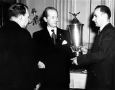 Fartygschefen på pansarskeppet SVERIGE kommendörkapten Mörner utdelar idrottspris ombord 1929. Berger har återgivit prisutdelningen även på Fo229156, Fo229193A, Fo229252C, Fo229255C och Fo229258C.