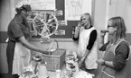 Lanthandel 9 juni 1966 En man och två kvinnor sitter vid ett fikabord under en kafferast i en lanthandel. De är klädda i arbetskläder. På bordet står två kaffekannor, en korg med fikabröd, tre kaffekoppar med fat och teskedar, en sockerskål samt en telefon. Bananlådekartonger står staplade i bakgrunden.