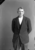 Kärnekull 30 juni 1966 En man i skägg och glasögon samt med ett glas med dryck och is i högra handen sitter på en vit parkbänk en solig sommardag. Han har en tidning i knät och håller i denna med vänsterhanden. Han är klädd i vit skjorta, randig mörk slips, mörk kavaj och ljusa byxor.
