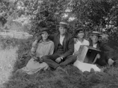 Hulda Hansson (1876 - 1975) blir uppvaktad med blommor, här på ett sjukhem okänt årtal. Hon arbetade som hushållerska hos konsul Kindal på Vasagatan i Göteborg. Han ägde Gumperts bokhandel (se Hembygdsskrift nr 13). Efter pensioneringen bosatte hon sig i sitt föräldrahem Vommedal Västergård "Sväs", där nu Brattåsgården ligger. Relaterat motiv: A1390.