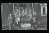 "Rosendal." Grupporträtt, kvinnor, män och barn uppställda på trappan till en byggnad. Längst fram sitter en man och en kvinna vid ett bord med blombuketter.
