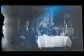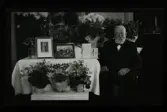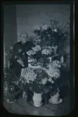 "Målsjö." Porträtt av en man som sitter vid ett bord fullt av gratulations-blommor.
