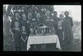 "Vid Lötmanstorp" Grupporträtt. Kvinnor, män och barn uppställda framför ett hus. Längst fram sitter ett äldre par vid ett bord med blombuketter.