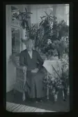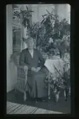 "Klara Karlsson, Ekeby." Porträtt av en kvinna som sitter vid ett bord fullt av gratulations-blommor.