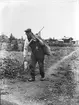 "Ors-Olle" går på stig med en säck över axeln. Rossön, Bodums socken, nordvästra Ångermanland.