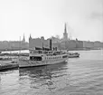 Fartyget under gång på Riddarfjärden på resa från Stockholm inåt Mälaren. Hörnhuset framför stäven på ångbåten är Norr Mälarstrand 22. Fotodatum: 1932-11-16.