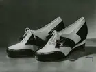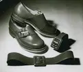 "Skor: Läderutstansnings A.B Skärp: Förenade lädervaror. Lädermarknad 1949" Promenadskor med gummisula, spännen, skärp i skinn med skinnspänne.