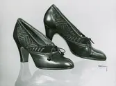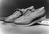"Promenadskor av det nya materialet Reloxkalv. Mellansula av kork". Sko med snörning och klack.