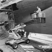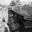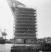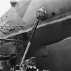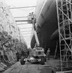 Holms skeppsvarv. Fiskebåten Västland (anm. felhört, hette Westland) under byggnad för Styrsö Tången, Bohuslän, 1951. Fyrmastskonaremn Else (RN 8342)från Skillinge under reparation. Skåne, Malmöhus län, Råå.