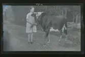 "Sommarflicka vid Rosenlund." Ung kvinna kör häst och vagn.