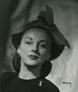 "Paulette". Modell, möjligen Hjördis Grundel-Starenius, klädd i hatt, mjukt formad kulle. Flor.