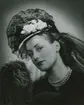 Porträtt av kvinna, möjligen modellen Hjördis Grundel-Starenius, i hatt med flor.