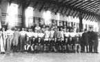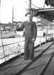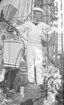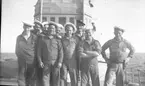 Bilden visar tre glada befäl i samtal ombord på skeppsgossefartyget Jarramas. I bakgrunden syns skeppsgossar på däcket.