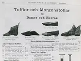 "K M Lundberg. Katalog 1901" Fotografi av sida ur varukatalog, Herr-Skinn-Tofflor, Herr-Skinn-Morgonstöflar, Dam-Skinn-Morgonstöflar, Dam-Filt-Tfflor.