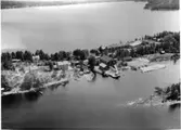 Medföljande text: "Gustafsberg omk. 1900-talet "Snäckan & Slottet, byggnaderna bakom roddbåten".