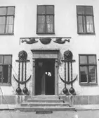 Brevkort adresserat till sjuksköterskan Amanda Palm. Motiv av Stadshuset i Gefle med ett ekipage av häst och vagn framför. Text på framsidan: "De hjärtligaste lyckönskningar på Namnsdagen den 26 okt 1904. Hälsningar Anna och Hilma".