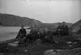 Från vänster: Stina och Elin från Nils-Nils, Göte Stjernholm, Olivia Stjernholm, Nils-Nils Johan (Johan Johansson), Karl Stjernholm, Smehammar-Elin (Elin Larsson), stenhuggare Bengtsson, Kattnäs-Axel (Olsson), Agnes Andersson (piga), Beda och Hanna Lundgren. Foto 1916-1918.