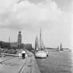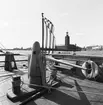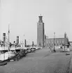 Stadshuset byggs. Utsikt från Strömbadet mot Stadshuset. Östra fasaden och tornet byggs.