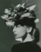 Porträtt av modell i stråhatt med ripsband, cirkelformad ljusskugga i bakgrunden. Av Gilbert Orcel.