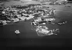 Flygfoto över Karlskrona flygstation med närliggande öar och byggnader, omkring 1920.