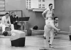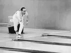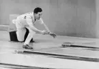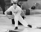 POSTMÄSTERSKAPEN (PM) I BOWLING I STOCKHOLM DEN 9 MAJ 1965. Lokal: Brännkyrkahallen. Arrangör: Postbankens IK. (Se Tidningen PS nr 6/1965). En av spelarna i en uttrycksfull pose. Ansiktsuttrycket skvallrar inte om det blev en strike.
