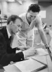 POSTMÄSTERSKAPEN (PM) I BOWLING I STOCKHOLM DEN 9 MAJ 1965. Från prisutdelningen på Stockholm Bans restaurang. Evert Bjurefors och Lennart Hedblad från Postens Industrier i Ulvsunda visar 4-mannalagets prisskörd.