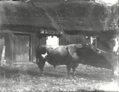 Exteriör. Två arbetare med stor tjur i lantlig miljö. Fotograf: Ellen Kock? Axel Lundbäck m.fl. Gullspångssamlingen. Bilder från Gullspång med omnejd.